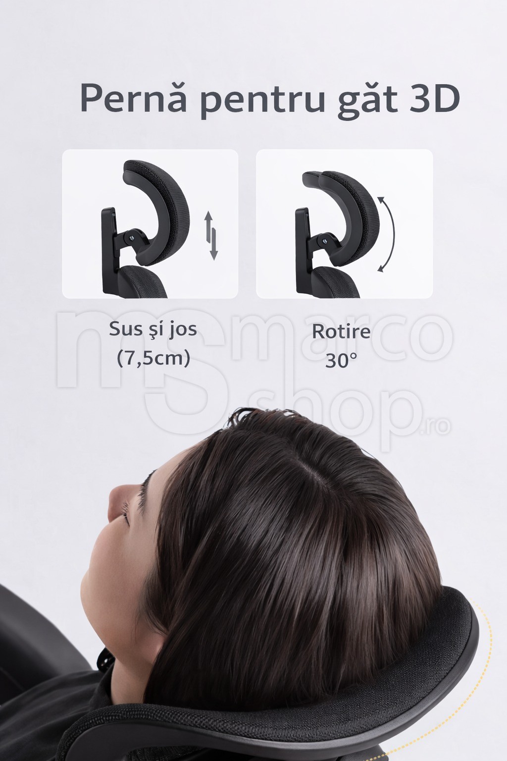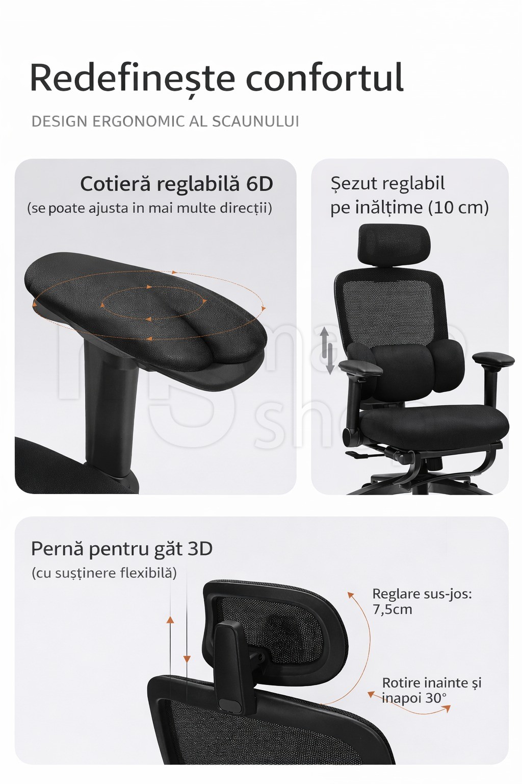 Tetiera reglabila sustine corect zona gatului si a capului, iar cotierele ergonomice asigura sprijin optim pentru brate, reducand tensiunea din umeri. Inaltimea sezutului este ajustabila, adaptandu~se perfect diferitelor staturi si birouri.