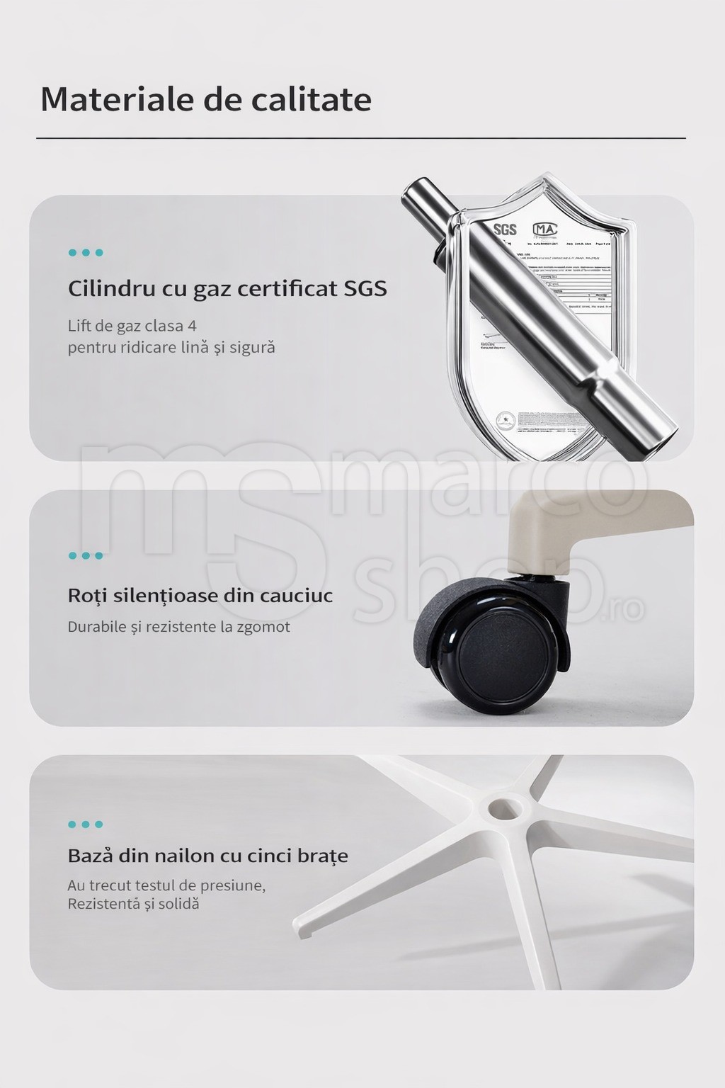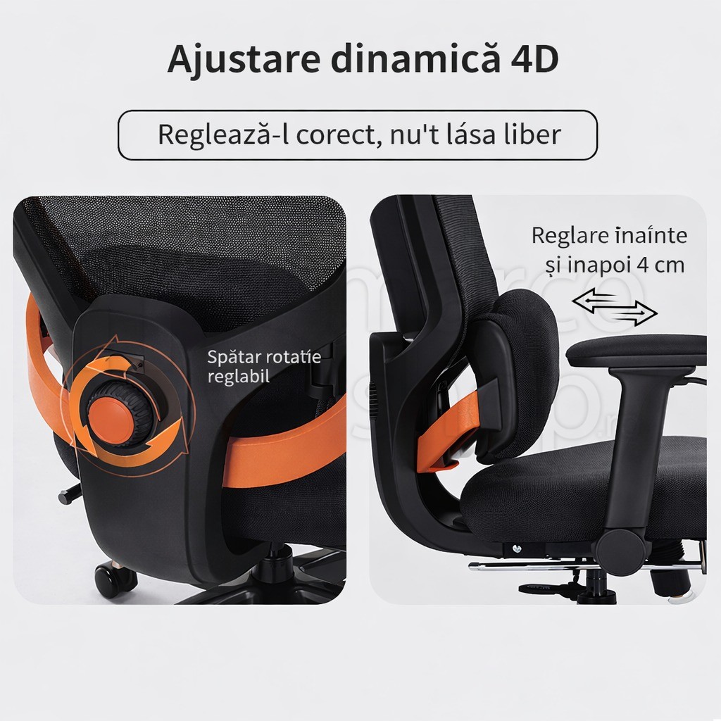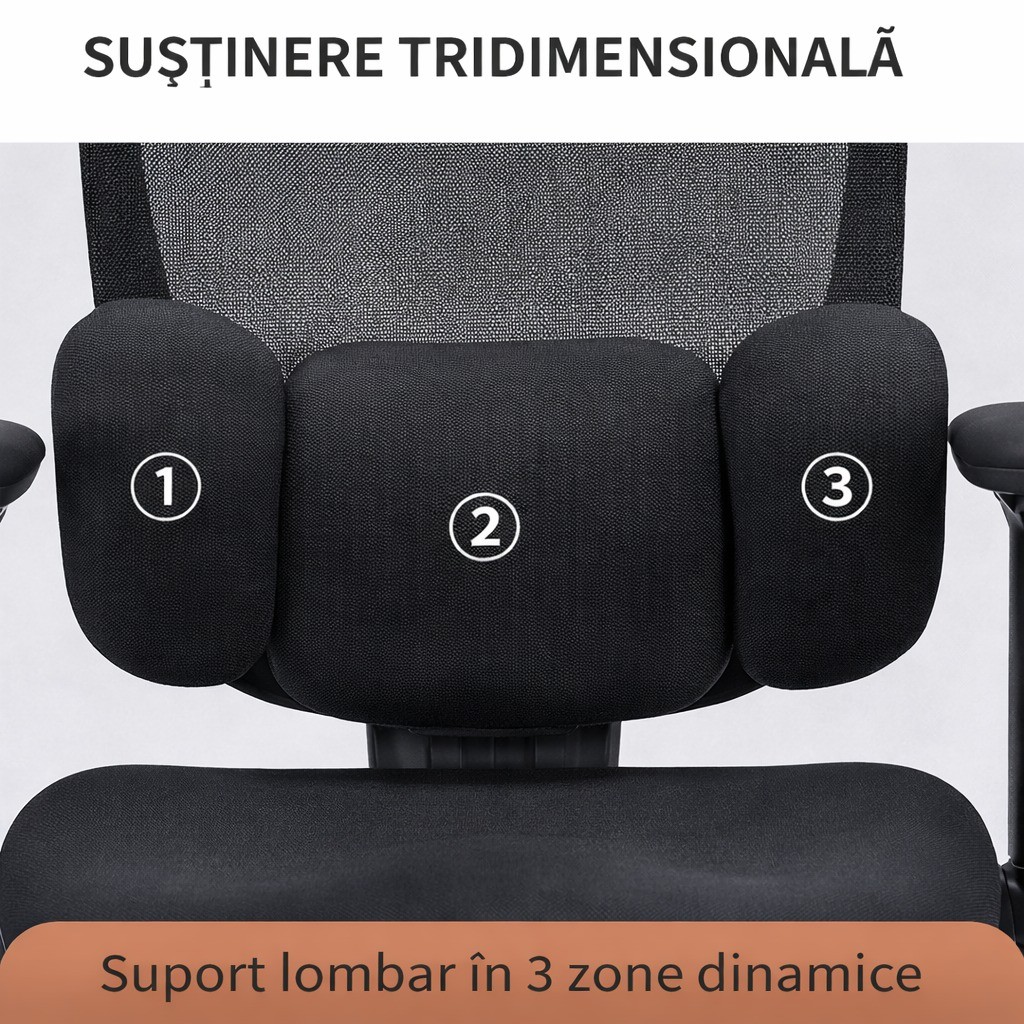 Scaunul este echipat cu spatar din mesh respirabil, care permite circulatia aerului si previne supraincalzirea, fiind ideal pentru utilizare zilnica, indiferent de sezon. Designul ergonomic urmareste forma naturala a spatelui, oferind suport lombar eficient si reducand presiunea asupra coloanei.