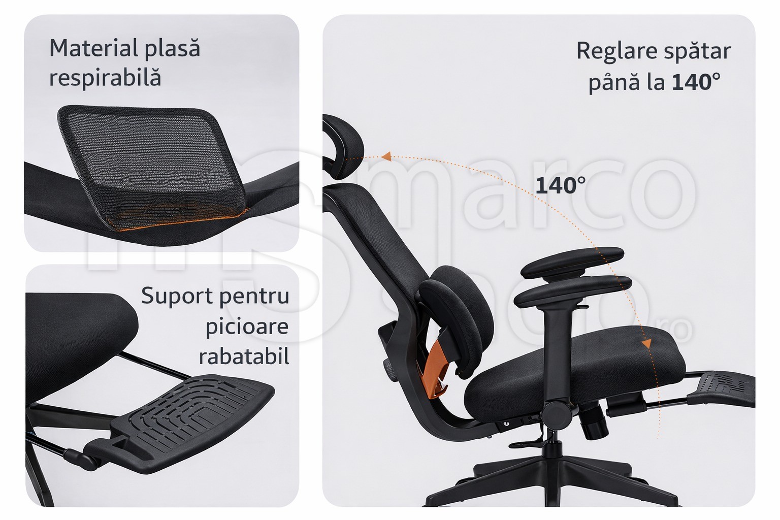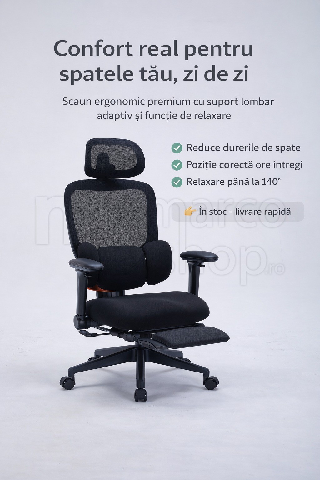 Functia de inclinare pana la 140° iti permite sa alternezi usor intre pozitia de lucru si momentele de relaxare. Pentru un plus de confort, scaunul dispune de suport pentru picioare rabatabil, perfect pentru pauze sau pentru a te intinde complet.