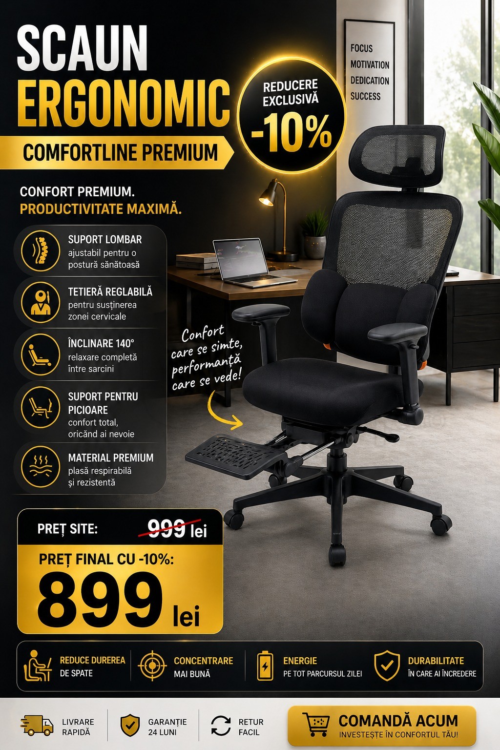 Scaun ergonomic ComfortLine premium cu suport lombar, tetiera reglabila, inclinare 140° si suport pentru picioare, Negru